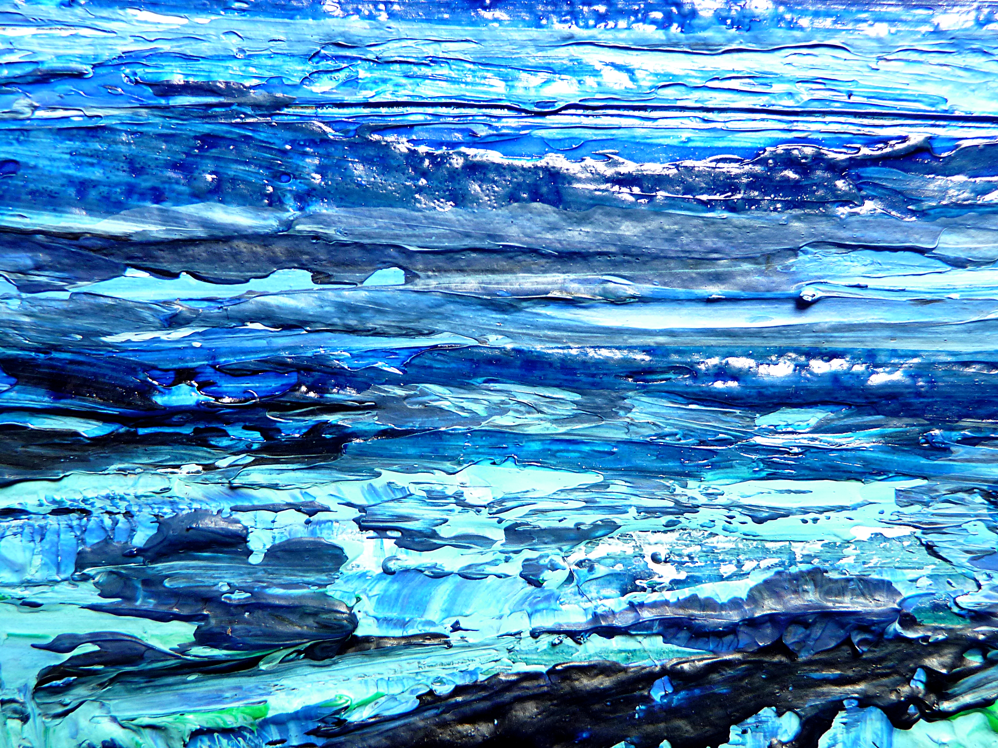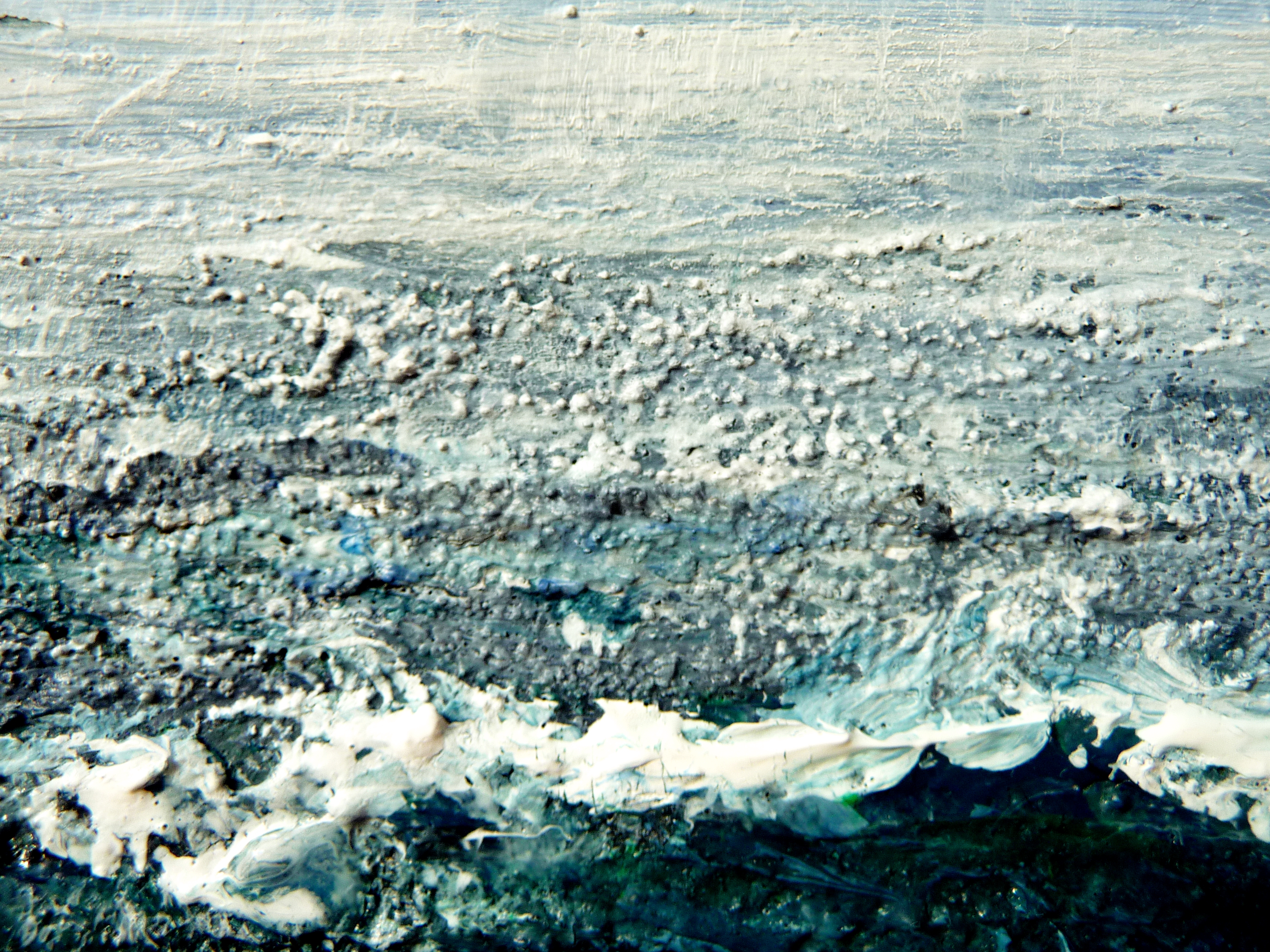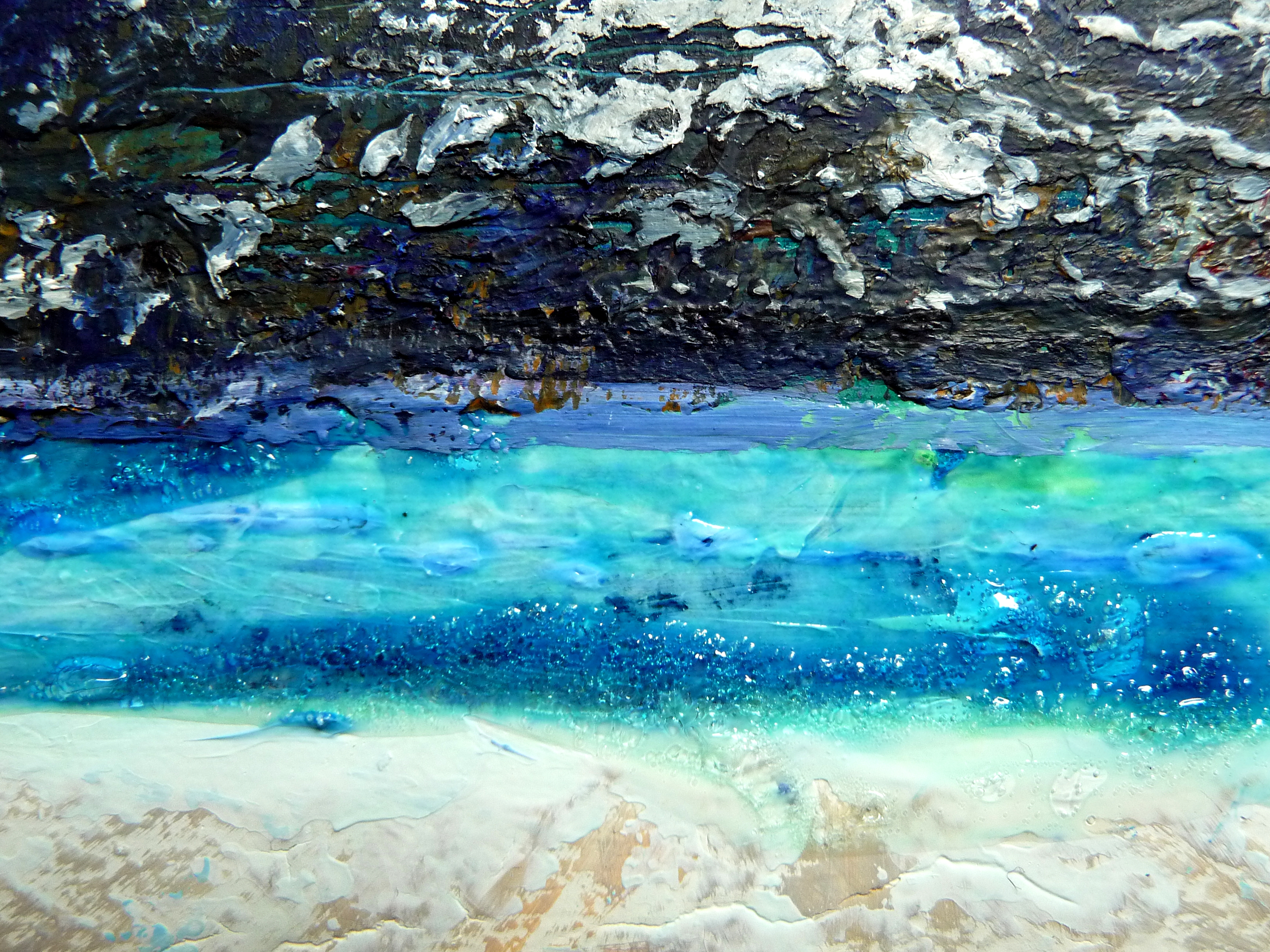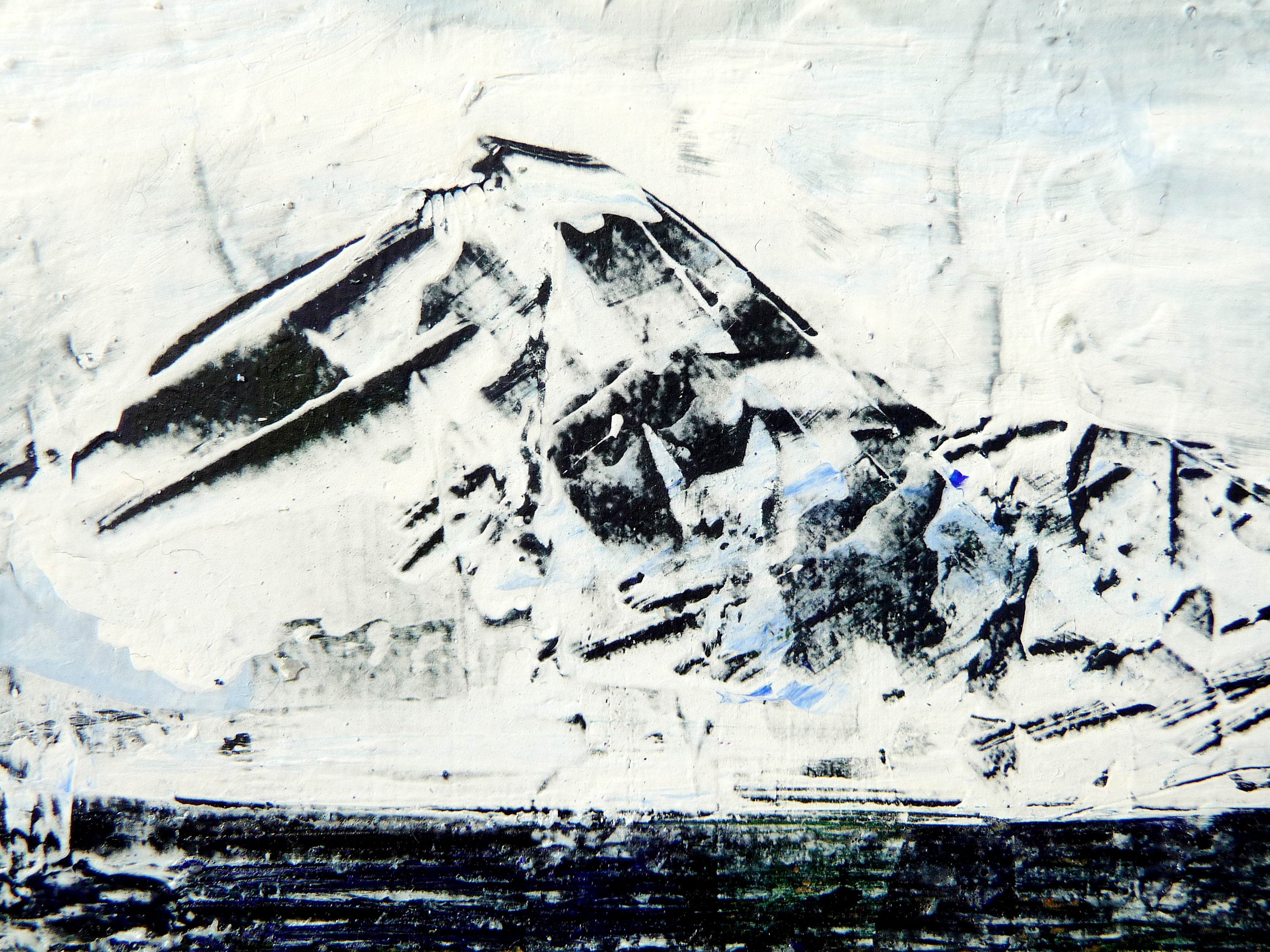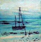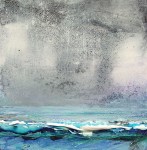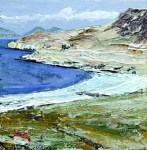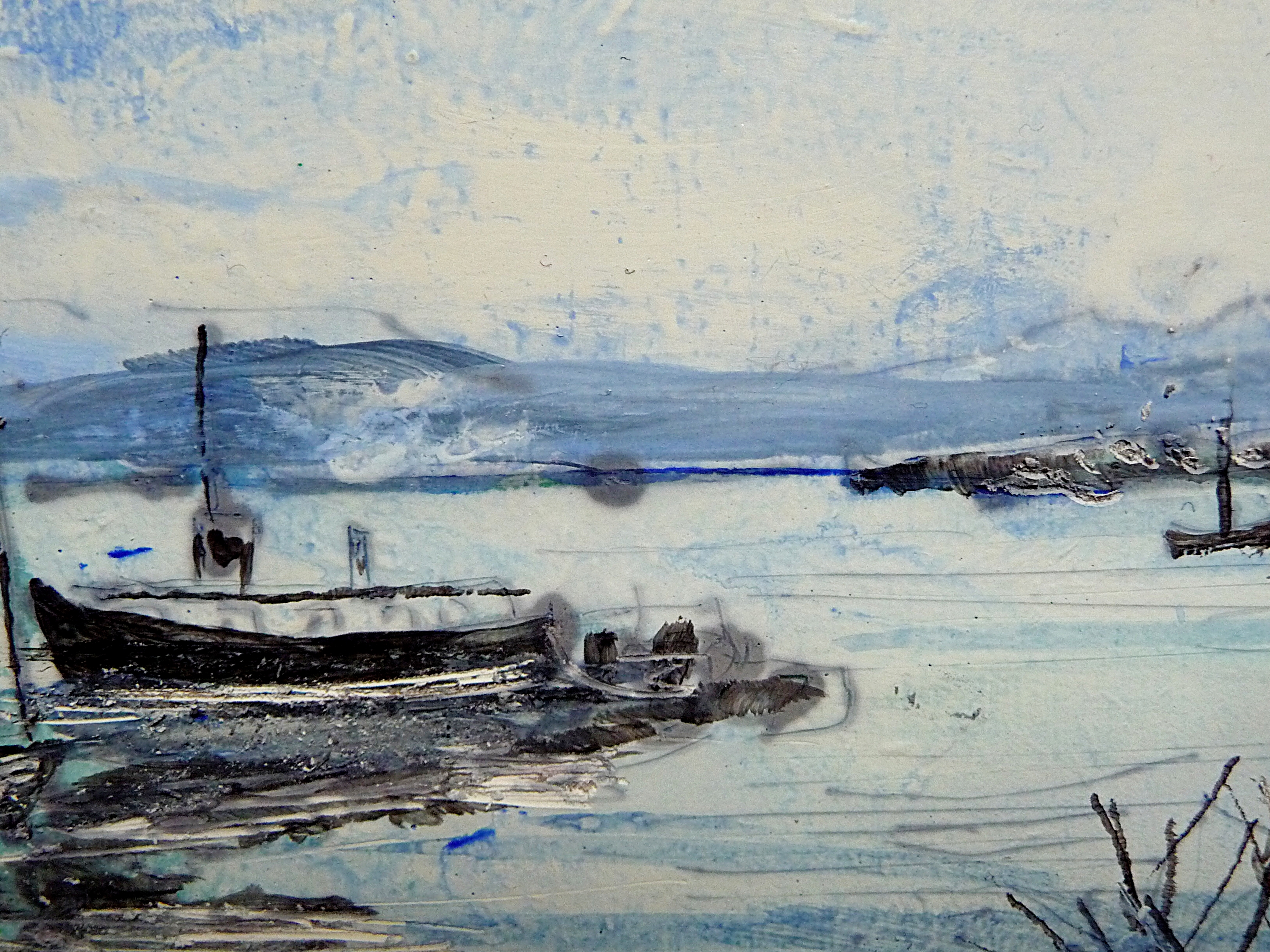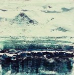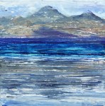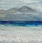 Today’s painting; mountains of Rum from Laig Bay. A deep blue/green base of acrylic was overlayed with gesso and white paint, into which mountain shapes were scraped with a palette knife. The foreground includes sand (from Laig Bay!) and subtle blue/green ink stain