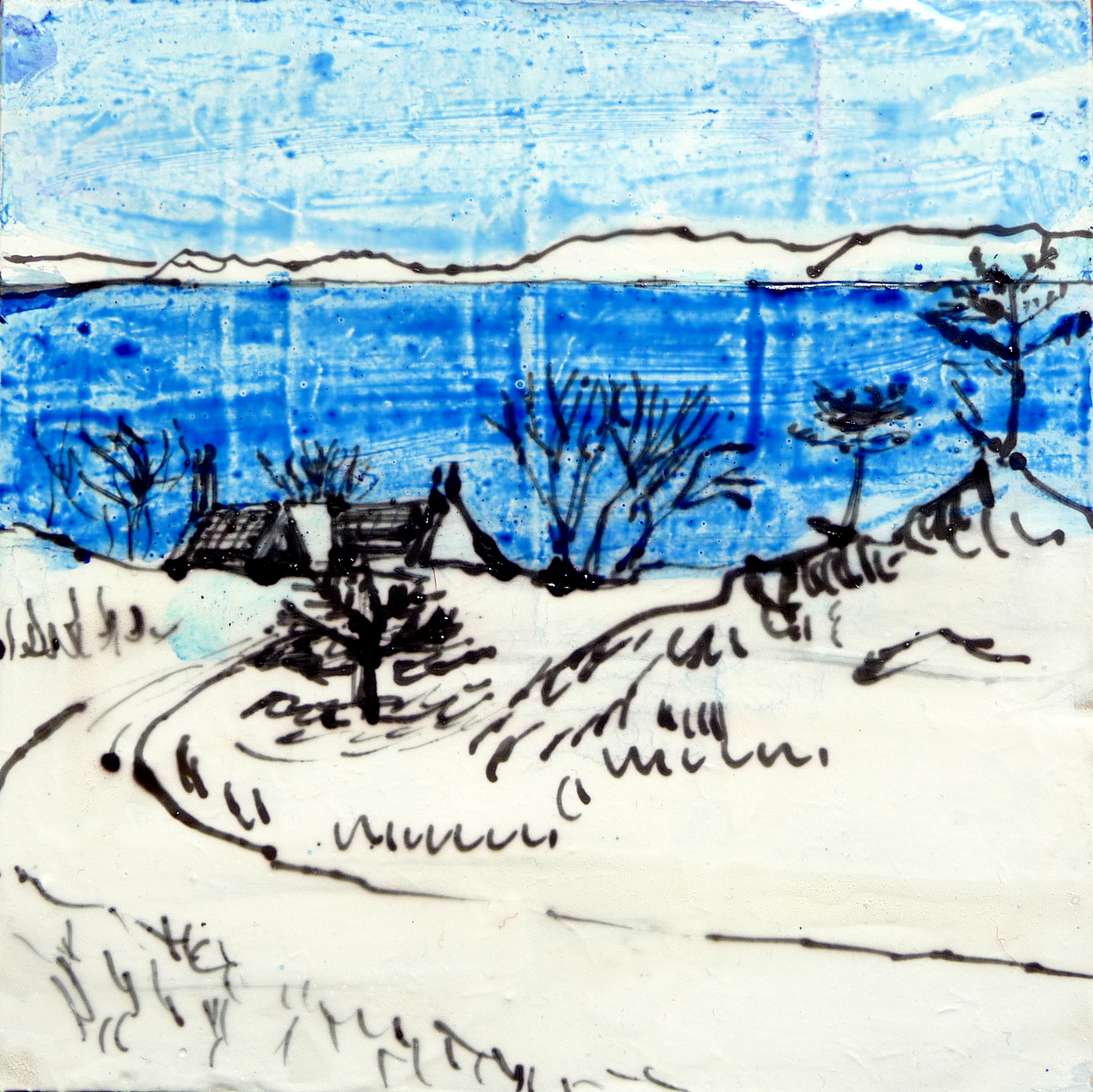 Today’s painting; a sketch of the view to the mainland from Eigg’s east coast, on primed wood in pen and black ink with a blue ink colour wash, sealed with varnish