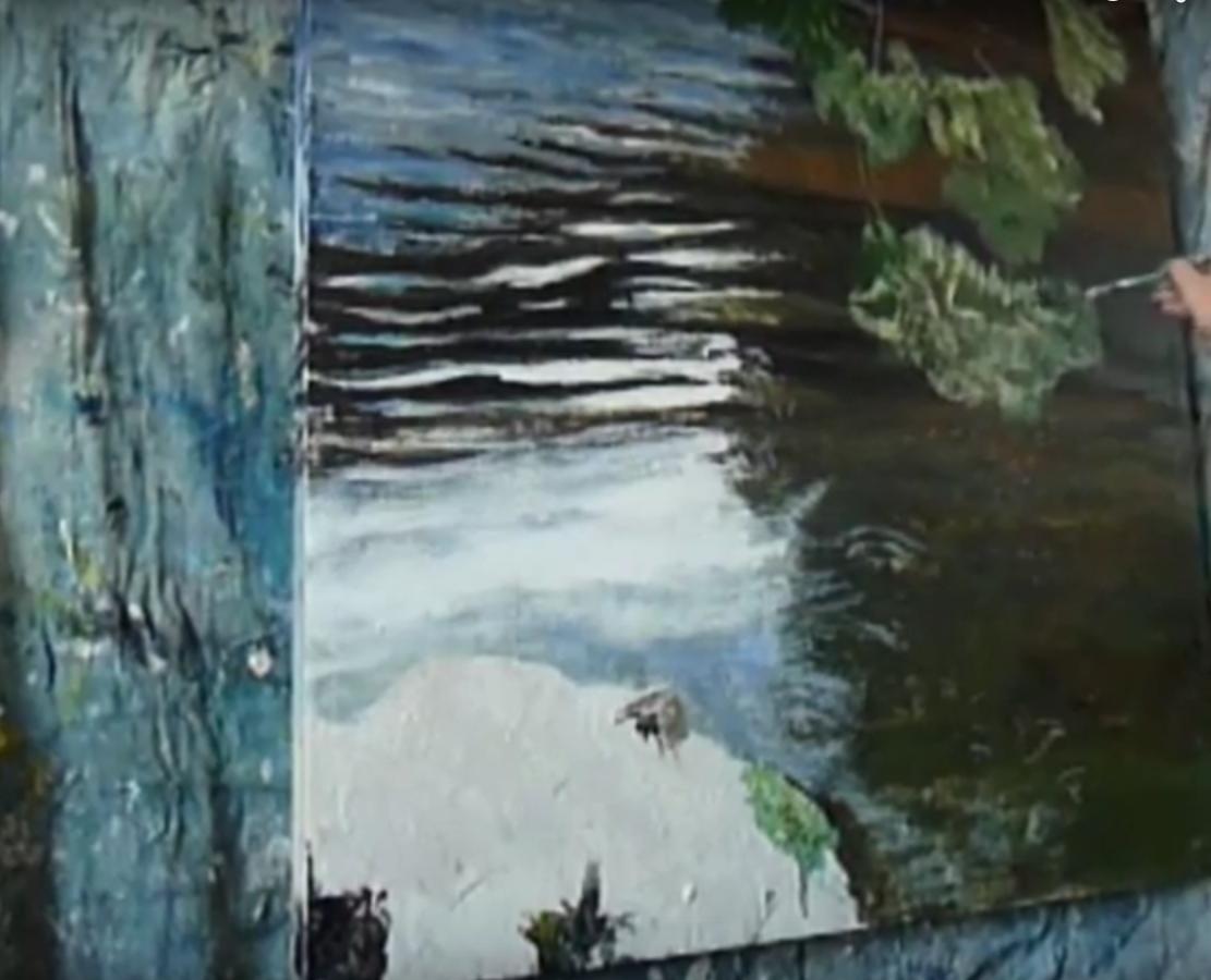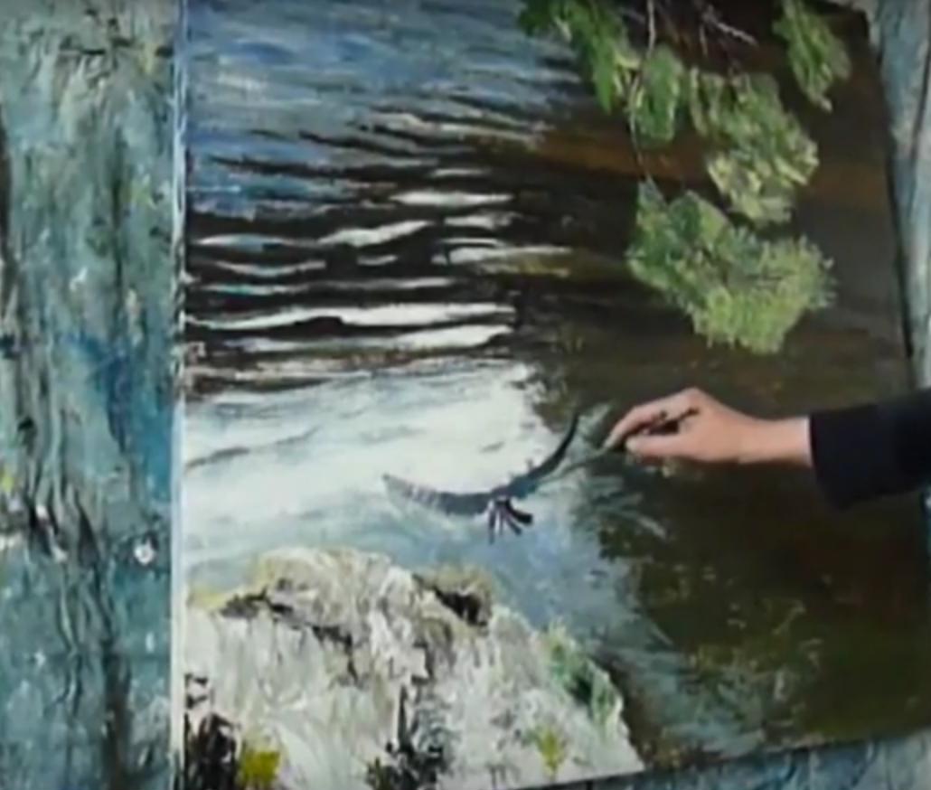 I painted the hawk using a small, flat brush and varying shades of blue, black, green, purple and grey. This is one part of the painting that had to be absolutely precise. Leaves and water can have varying edges, but everyone knows the shape of a hawk! To balance their hand, artists often prop one finger against the surface, but practice and confidence makes the hand steadier. It’s about decisive mark-making – with a feel for flow, softness or energy and so on.