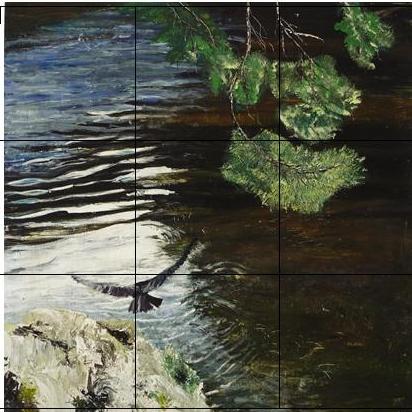 Although I wasn’t thinking of the golden mean when making these original decisions, for this post I thought it would be interesting to retrospectively place a grid over the cropped photo and the painting. As you can see in the two photos below, the hawk hits the lower left intersection, and is echoed by the top-right diagonal of the trees. The rock is within the lower section and most of the tree is in the top right. Both tree and hawk break through the lines a little though. I think it creates a tension – you know the hawk is about to turn right and swoop down, the branches point the way.