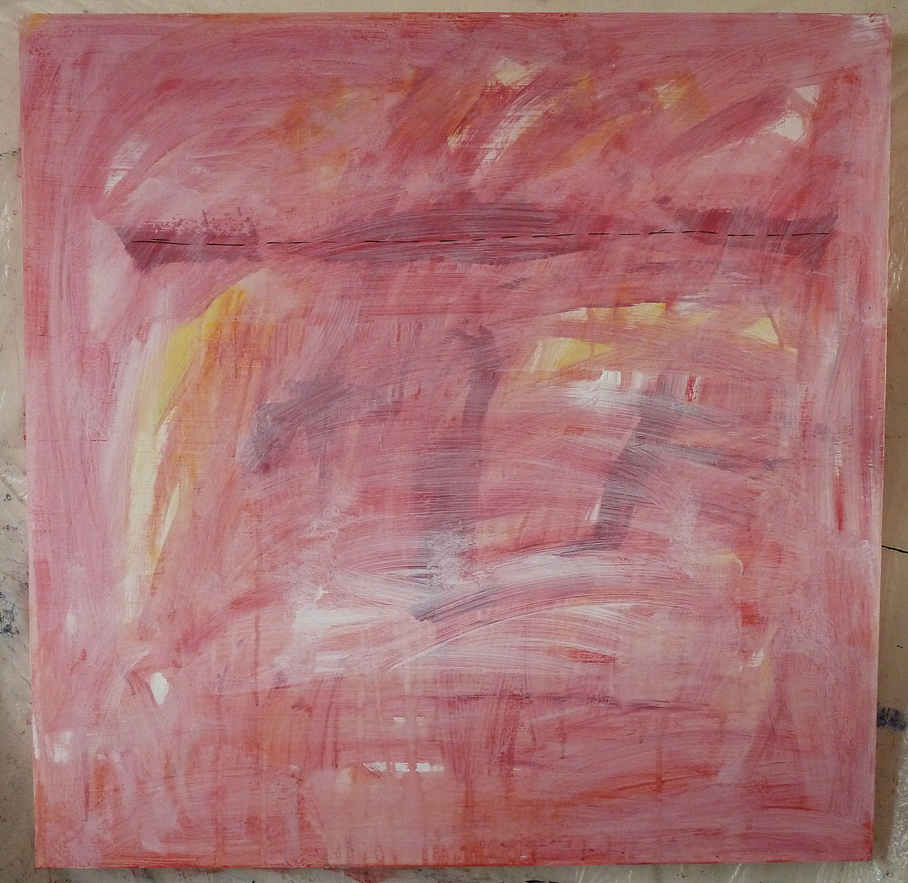 Also (below) the base for ‘Damascus Rose 2’, next in the series of three. I’ll be blocking out lines to reflect a map of Damascus, then overlaying with textured black and removing the blocking to reveal these tones underneath, though I can see other possibilities in this, and see the vague figures of a horse and two figures crossing a plain in sunset, but I’ll stick to the plan hopefully –