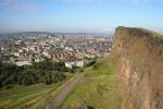 After volcanic activity ceased, the landscape was submerged under sea water. Sedimentary rock (formed by waves of sediment washed over the land by water over millions of years) then began to form the Salisbury Crags (the cliff seen in my painting and in photo to the right), which were gradually tilted up to their current dramatic angle as pressure eased after the ice age.