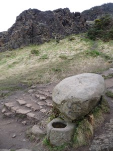 Although I’ve been walking around Arthur’s Seat since I was a kid, the fact that I now live so close to it has inspired me to explore more, and I’m beginning to get an ‘eye’ (with the help of my archaeologist friend Sabine!) for Bronze-age remains (shapes or patterns in the land as opposed to actual buildings) not to mention spotting Edinburgh’s early sites of worship, healing or spiritual interest – such as wells; the traces of which can be found alongside later Christian religious buildings and sites (more on this in later blogs).