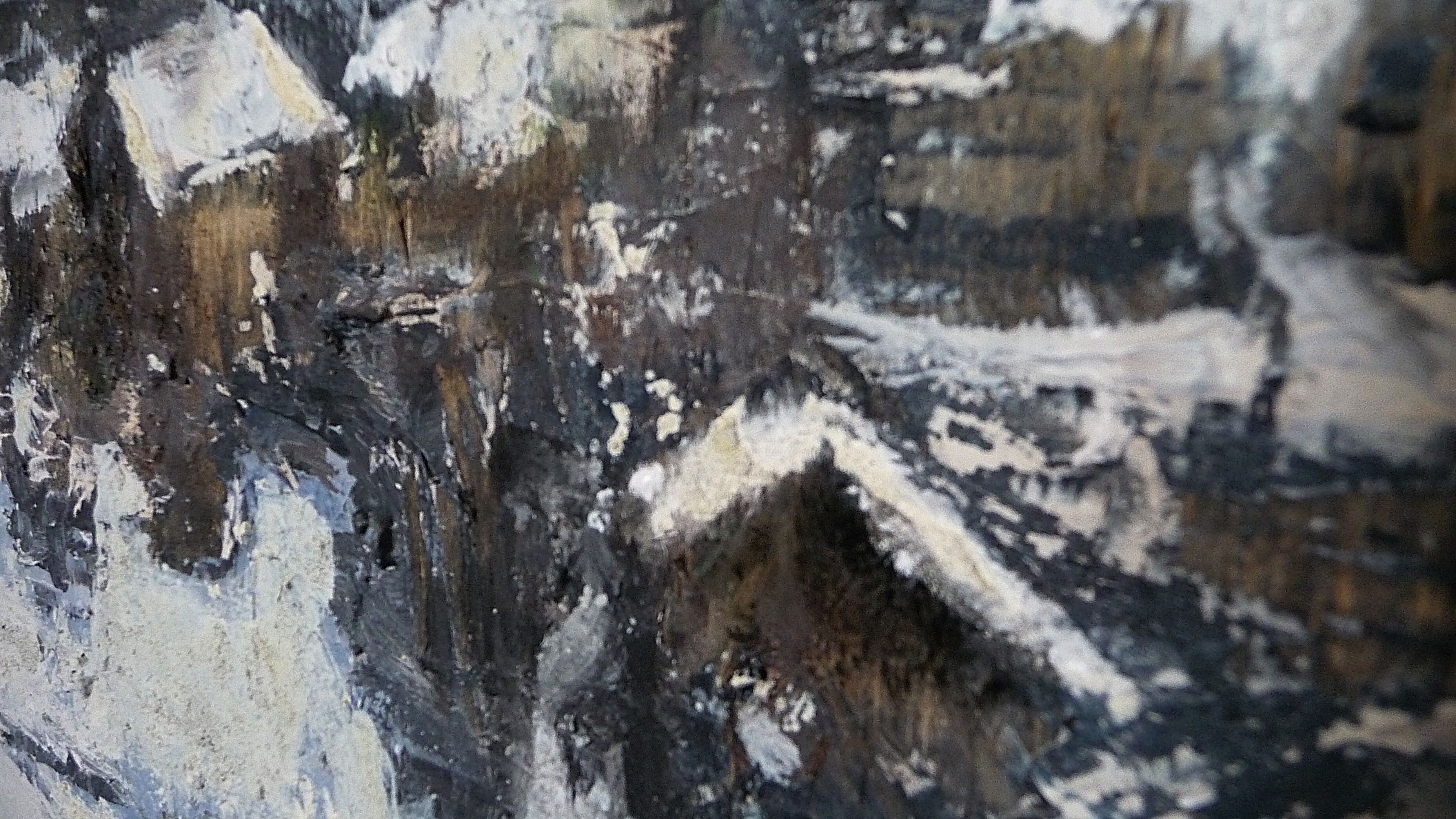 Not for sale. Edinburgh Snow (High Street and Arthur’s Seat from Regent Road). Mixed media on 22×16 inch found wood panel. Rose Strang 2018
