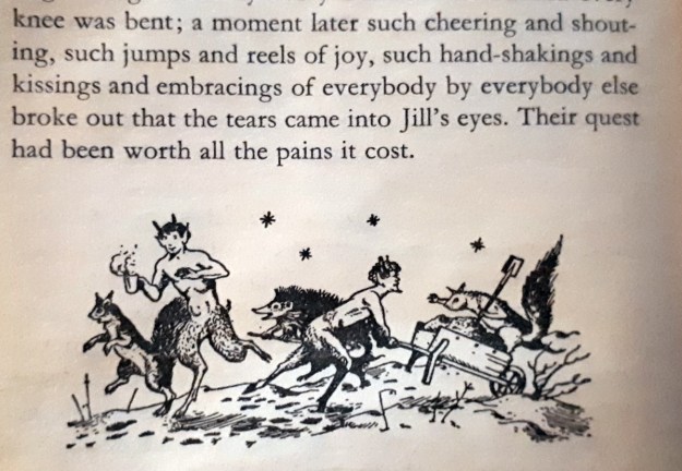 Aslan explains that due to her mistakes, their task will be more difficult. They must find King Rillan who has been enchanted and lost for many years. He warns Jill that thoughts will become vague in the land below, he then transports her down to Narnia where she encounters Eustace. They then embark on their adventure with the wonderful Puddleglum – a somewhat pessimistic creature called a Marshwiggle who lives in the wet marshes of Narnia.