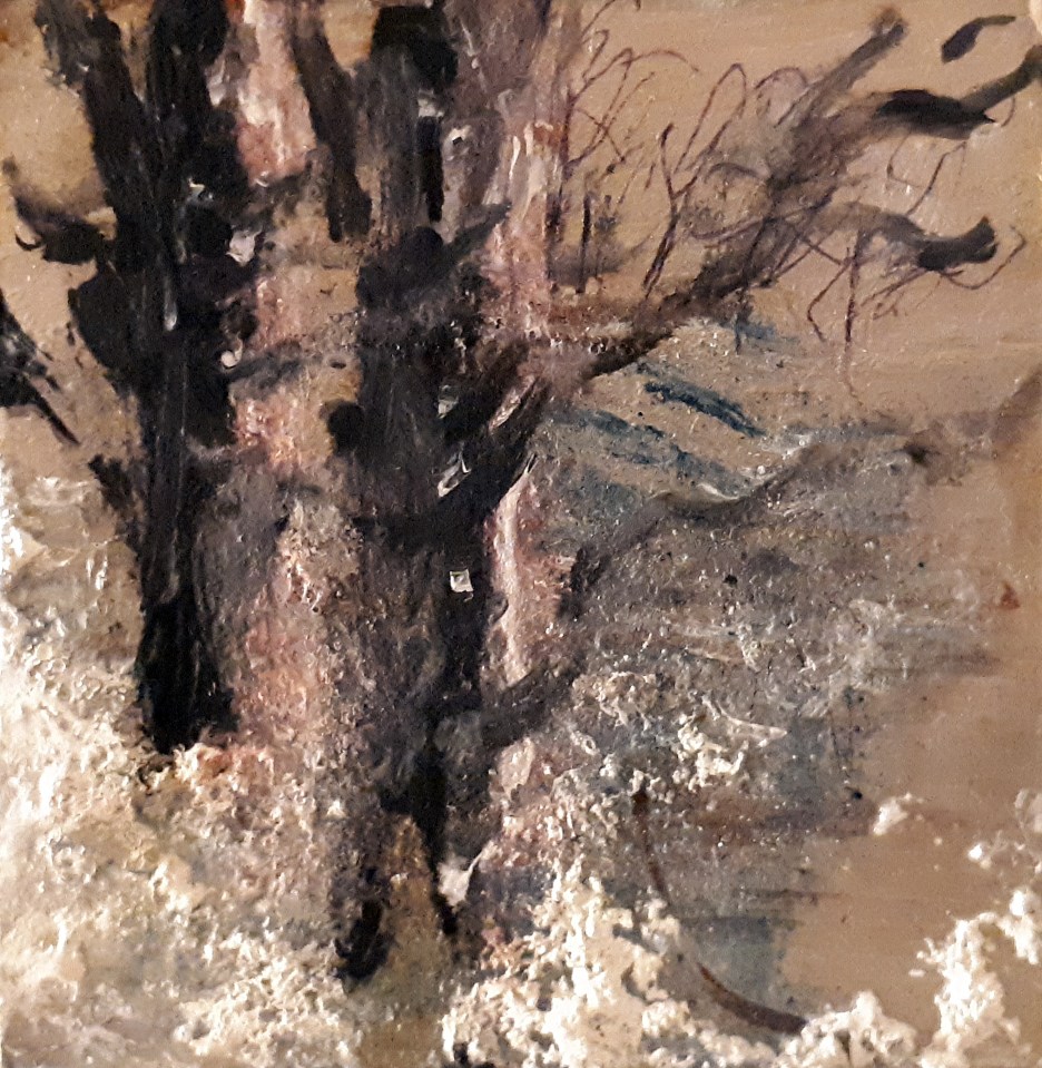 20191203_194353 ← Previous Next → Sold. ‘Winter Miniatures. Sunset’. Mixed media on 3×3″ wood. Rose Strang 2019