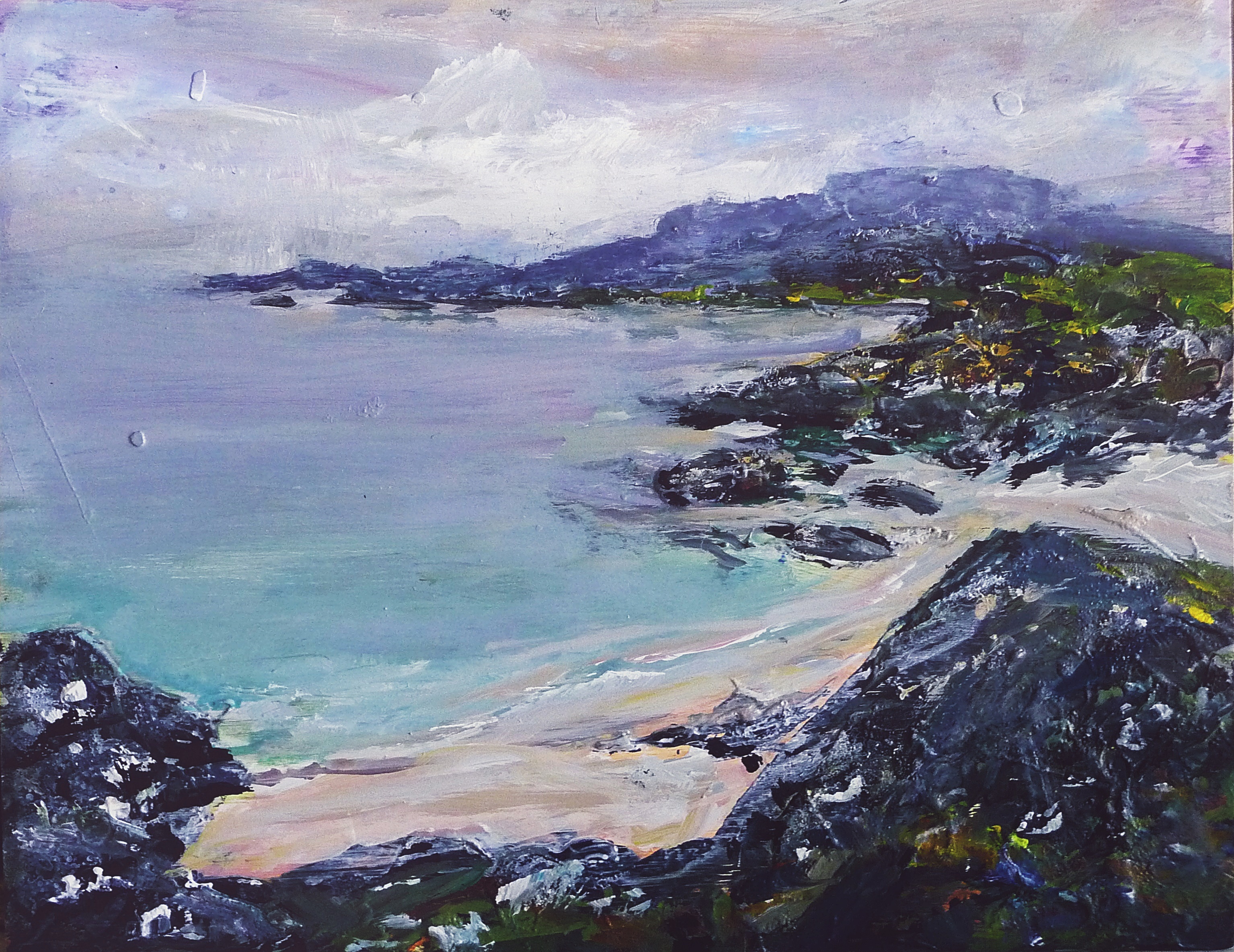 - ‘Dusk, Sanna Bay’. Mixed media on 14×11″ wood panel. Rose Strang, 2019. £495