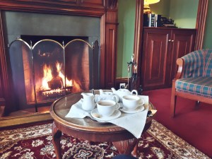 I loved it – the warmth and hospitality, the scent of woodsmoke in the air, wild venison and mash for dinner, a huge glass of red wine to take up to our room with its medieval-looking furniture and ancient paintings of Highland scenery, and in the morning the view from our room of mountains over the tree-tops.