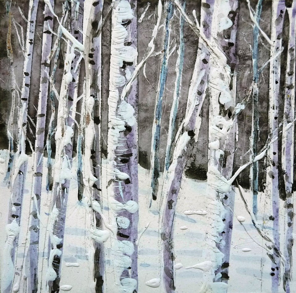 ‘Winter Birch’. Mixed media on 5×5″ wood. Rose Strang 2013