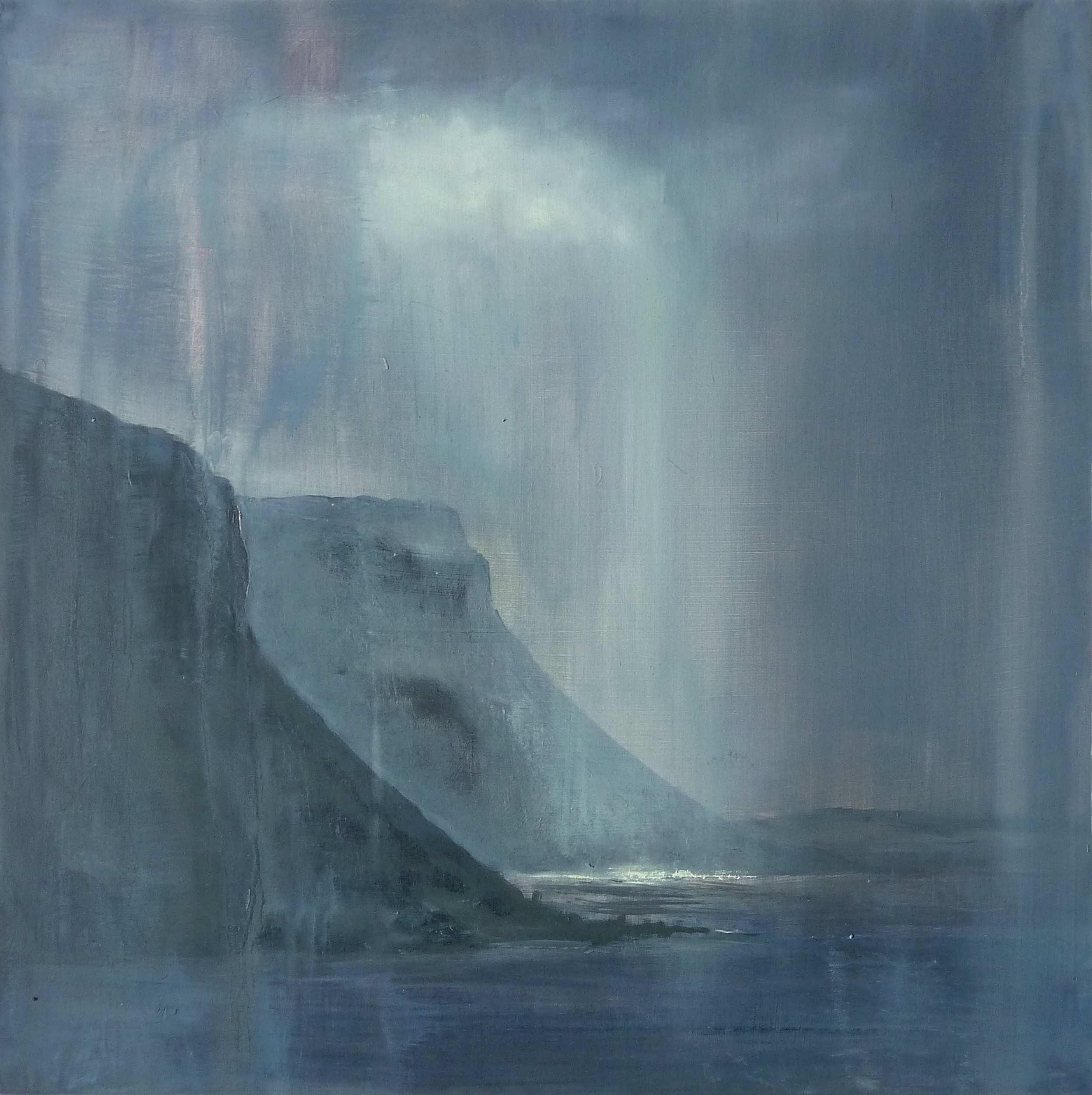 ‘Cliffs of Griburn, Loch na Keal. Mull’. Oil on 20×20 inch wood panel. Rose Strang 2021