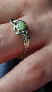 Adam and I got engaged! It’s a very special ring; the stone is taken from a rock I found on the Isle of Iona about thirty years ago. It’s from a rare seam of white marble streaked with green serpentine that’s found on the south coast of the island – the same stone was used for the alter of Iona Abbey.