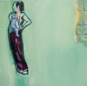 Although the character on the left is based on me I wanted to make it more anonymous. The exagerrated outline brings something stronger to the painting and rubbed out areas bring more mystery I hope.