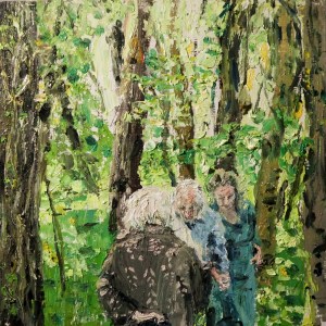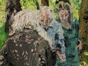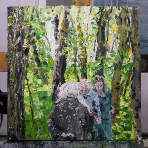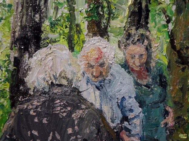 A bit more definition would help the painting and a few tweaks on the faces. The figure I’m happiest with is that of Terry Ann Newman (in the foreground with her back to us). Terry is the Deputy Director of the Demarco Trust and a very talented artist, when she finds time to paint. She’s holding a mobile in her hand behind her back, and it’s part of this series that we’re recording and witnessing the day in our different ways – there will be more of that.