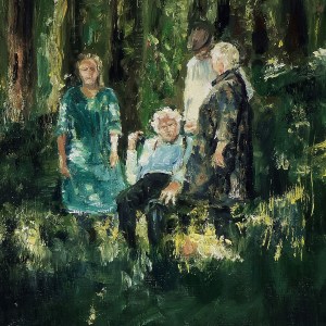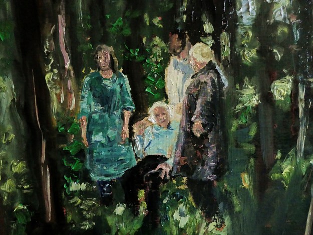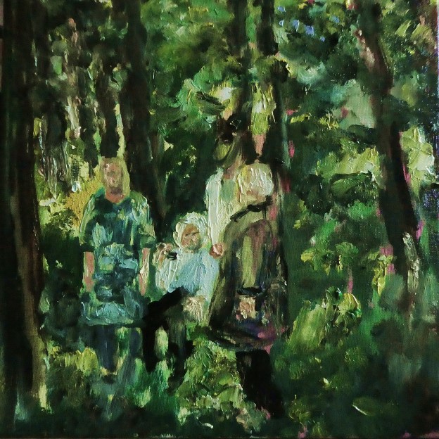 This is the largest in a series of the same subject. I wanted to create it on a large scale to really get the sense of the figures in a forest – possibly lost, or perhaps they’ve discovered themselves in a different realm or time!