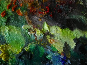 A detail and a close up of my palette – there’s always a nice build up of the coour scheme by the end of a series, then it’s all scrubbed back (this is a glass palette so it’s easier to scrub back) before the next series. …