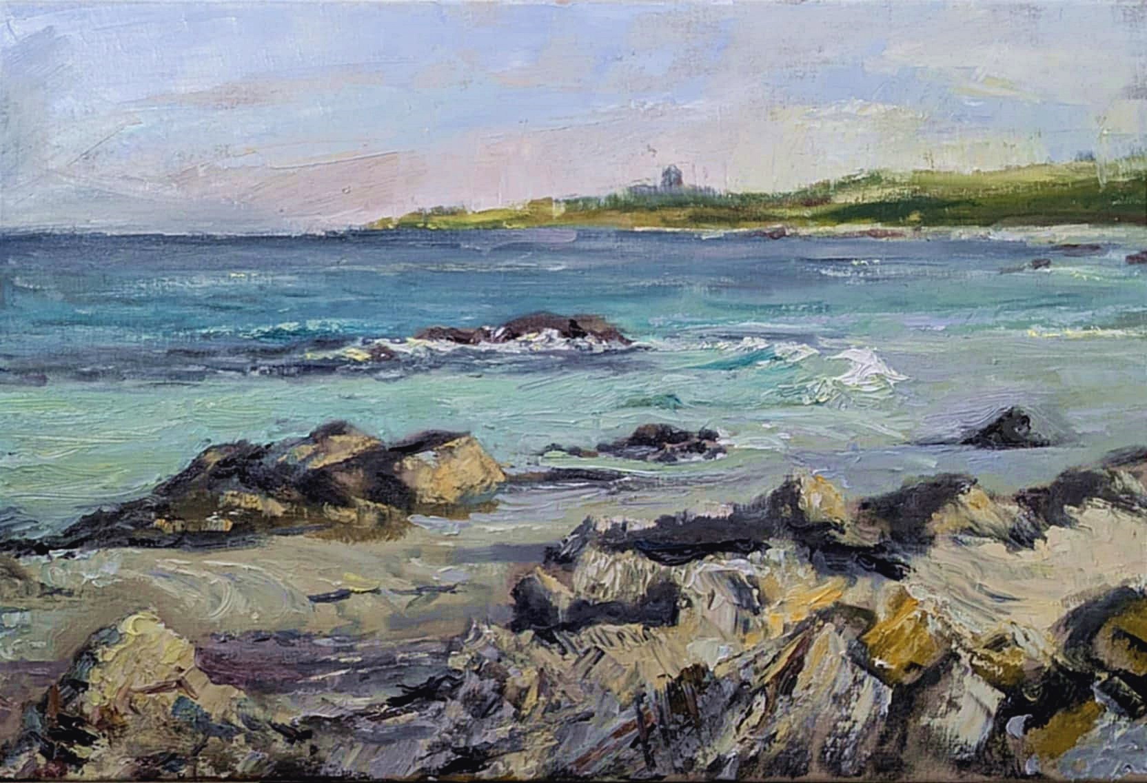 Iona Abbey from North Beach. Oil on 30×20″ linen canvas. Rose Strang 2025