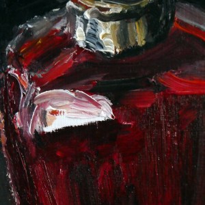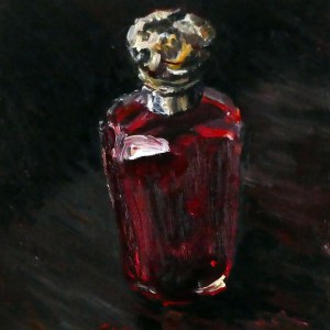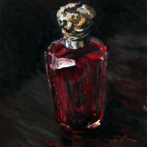 Sold. ‘Antique Perfume Bottle, Red’. Oil on 13×13″ wood. Rose Strang 2020