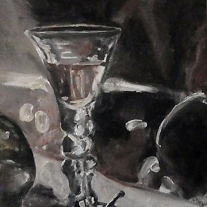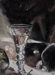 Today’s still life; an 18th century Baluster wine glass – a type of glass with a heavy stem featuring bulbous patterns. I love those horizontal marks near the top of the glass that show the glass has stretched and that it’s hand-made. Isn’t it interesting that they would have worked so hard to remove these ‘flaws’ and nowadays we value them as part of the maker’s marks – not mass produced?