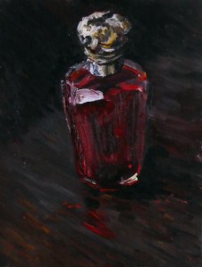 Above: Red Perfume Bottle with Silver Cap. Oil on 12 by 9 inch wood panel. Rose Strang 2025