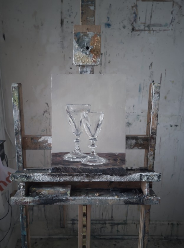 18th Century Toasting Glasses. Oil on 12 x 9″ wood panel. Rose Strang 2026