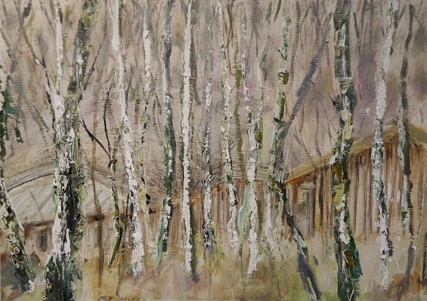 Above: Through Trees. Pishwanton. Mixed media on 20×30″ wood pane. Rose Strang 2026.