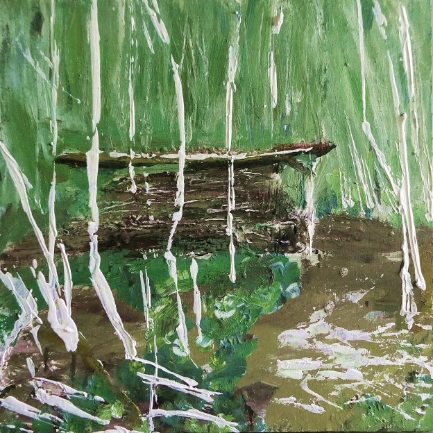 Above. Birch Trees and Willow Shelter. Mixed media on 14×14″ wood. Rose Strang 2026.