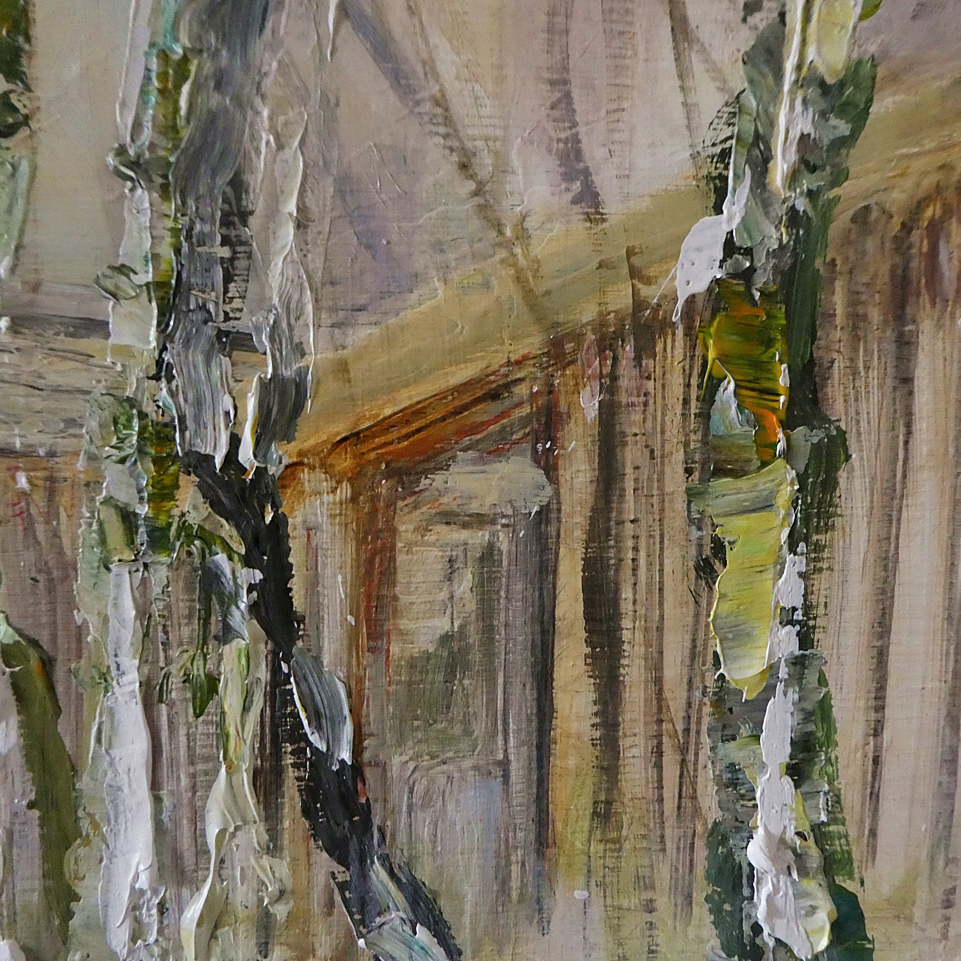 P1150652 Next → (detail) Through Trees. Pishwanton. Mixed media on 20×30″ wood pane. Rose Strang 2026