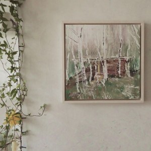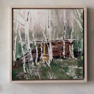 Above: Birch Trees and Willow Shelter 2. Mixed media on 14×14″ wood 2. Rose Strang 2026