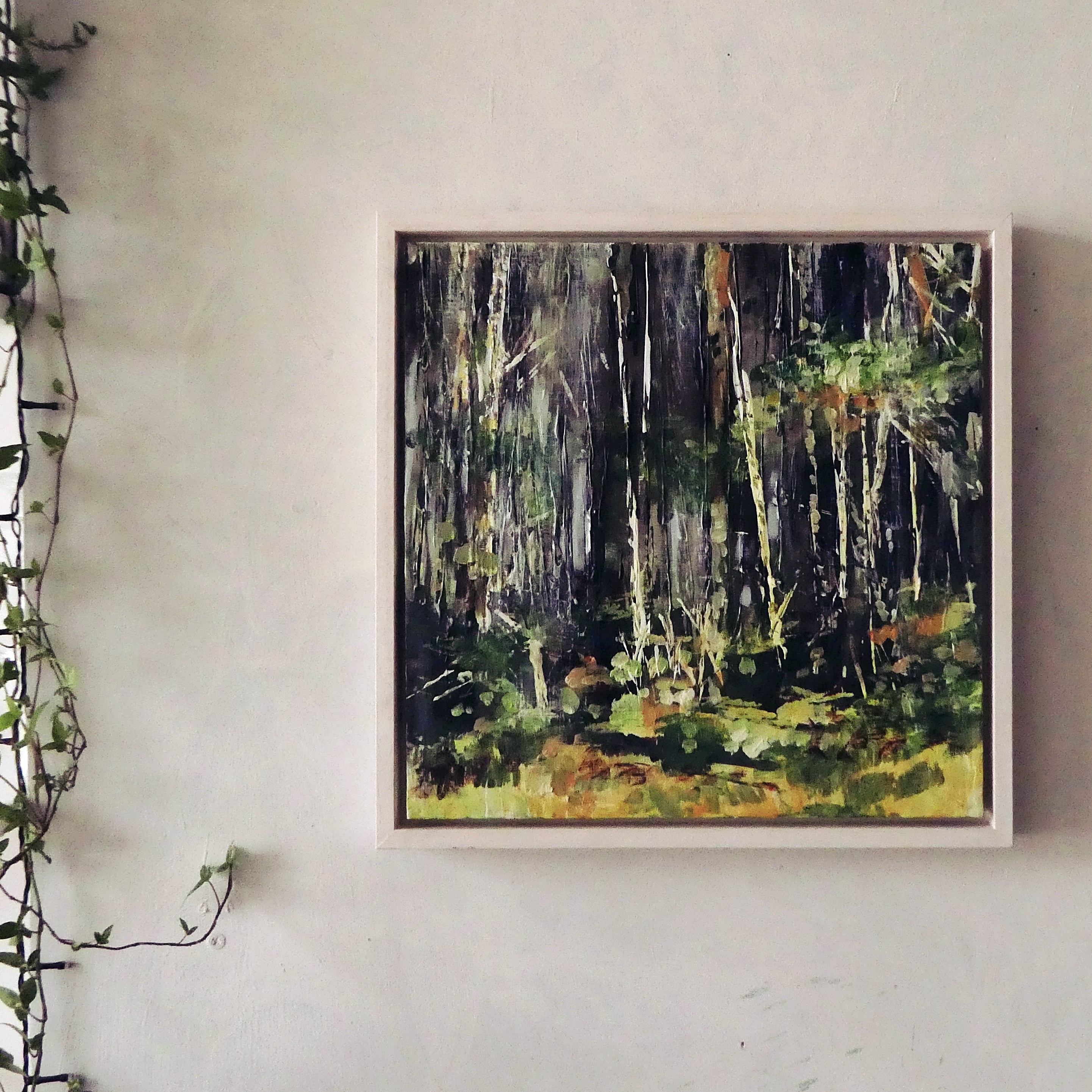 ‘Birch Forest’. Fairhill. Mixed media on 14×14″ wood. Rose Strang 2026