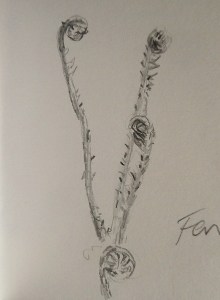 Given that I was there to let nature speak to me, rather than impose my big artist’s ego onto the scene, I decided to follow it! It veered off just before the willow shelter, I looked down and saw a tightly curled fern amidst the swaying slender birches and though ‘this’ll do’.