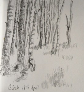 Above: Birch Trees. Fairhill. 18th April. Charcoal on A4 paper. Rose Strang 2026