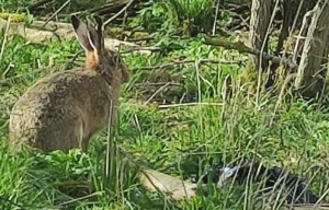 Adam painted a watercolour, then, our legs stiffened up by kneeling on the damp moss (we’re getting too old for all this kneeling and will bring fold-out stools next time!) we decided to head off in search of Goblin Ha’ in the valley of Yester. As we drove off, the large hare ran alongside to see us off!
