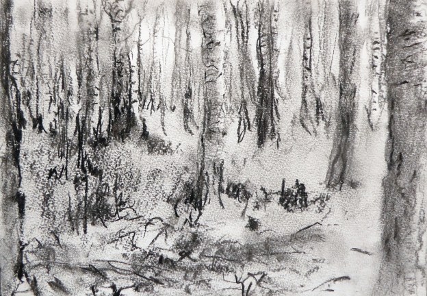 I sketched a couple of those and the birch forest in pencil first. Then three sketches in charcoal.