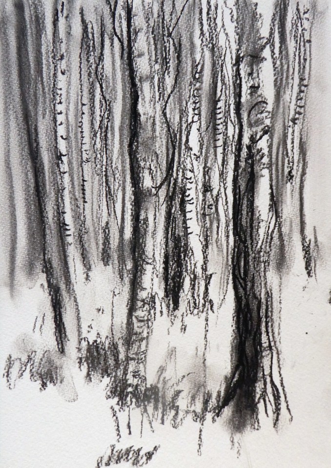 ‘Birch Trees, Fairhill 4. Charcoal on A4 paper. Rose Strang 2026