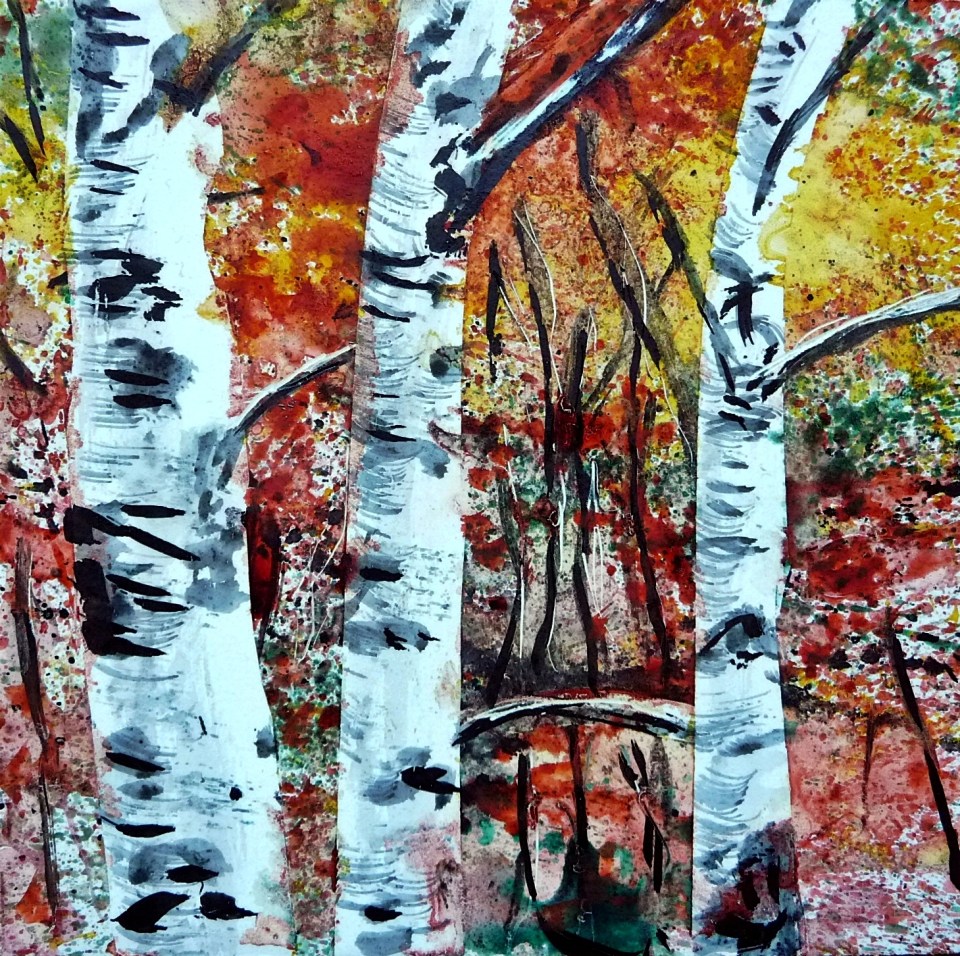 Sold. ‘Autumn Birch’. Mixed media on 5×5″ wood panel. Rose Strang 2013