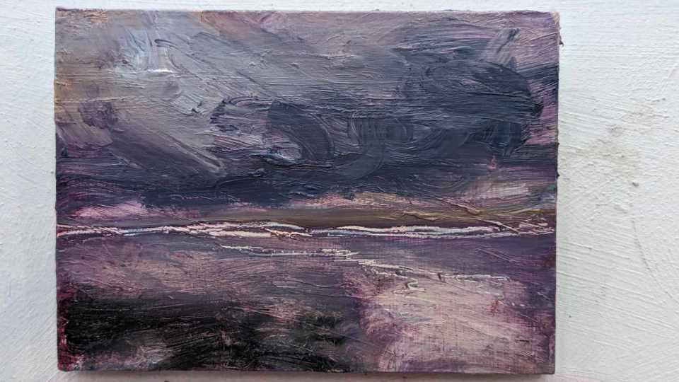 Aberlady. Winter IIII. Oil on 8×5.5 inch wood. Rose Strang 2024.