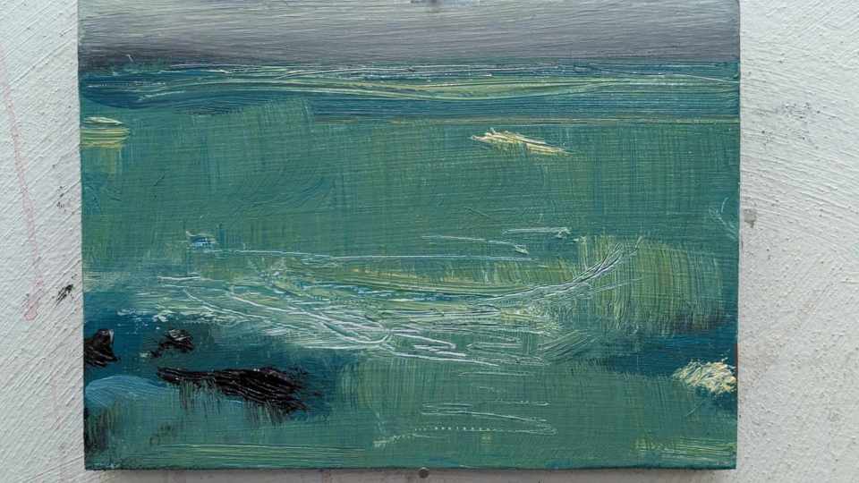 Aberlady. Winter II. Oil on 8×5.5 inch wood. Rose Strang 2024