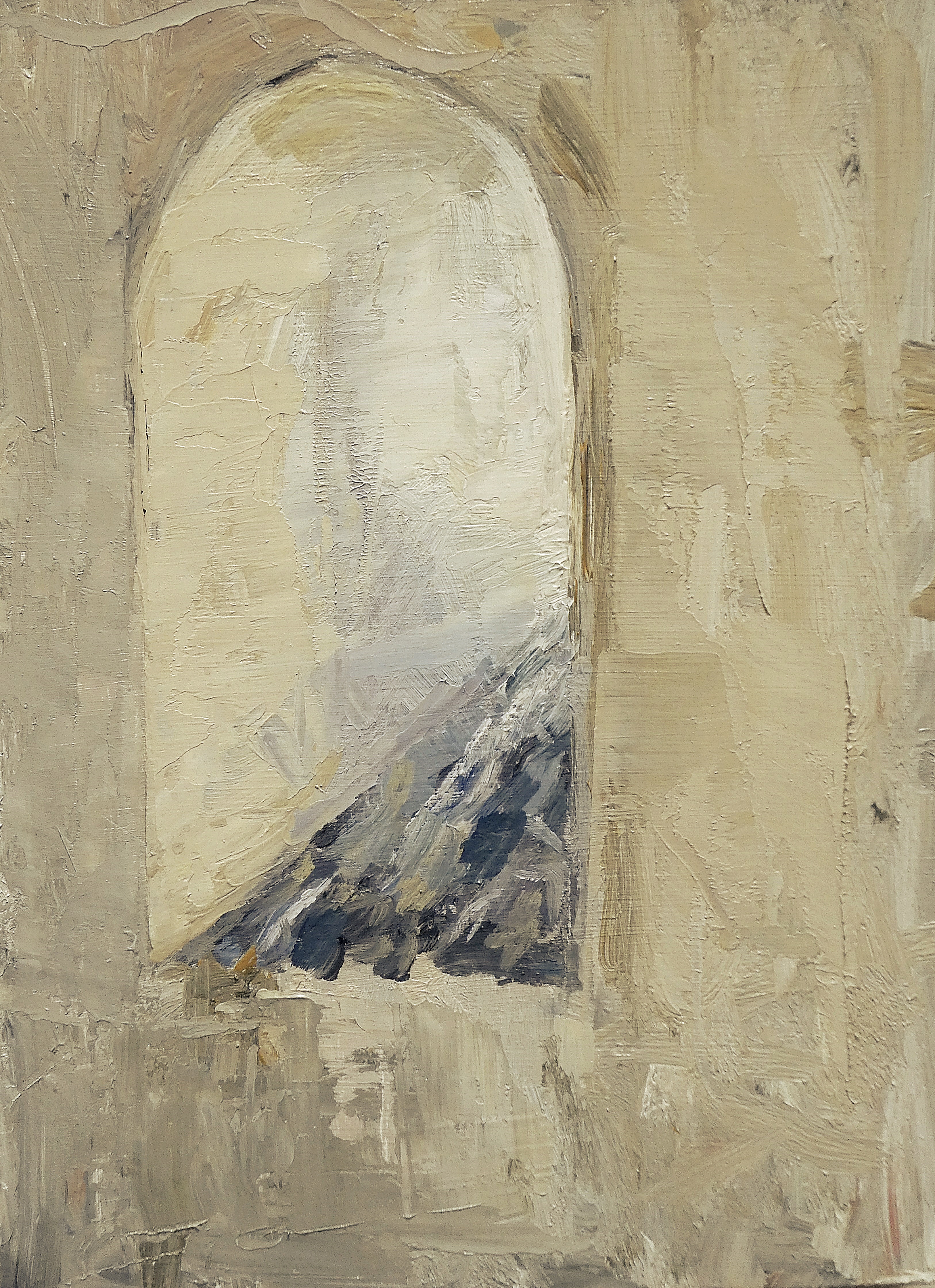 St Oran’s Chapel, Iona 2. Oil on 5×7″ wood. Rose Strang 2023