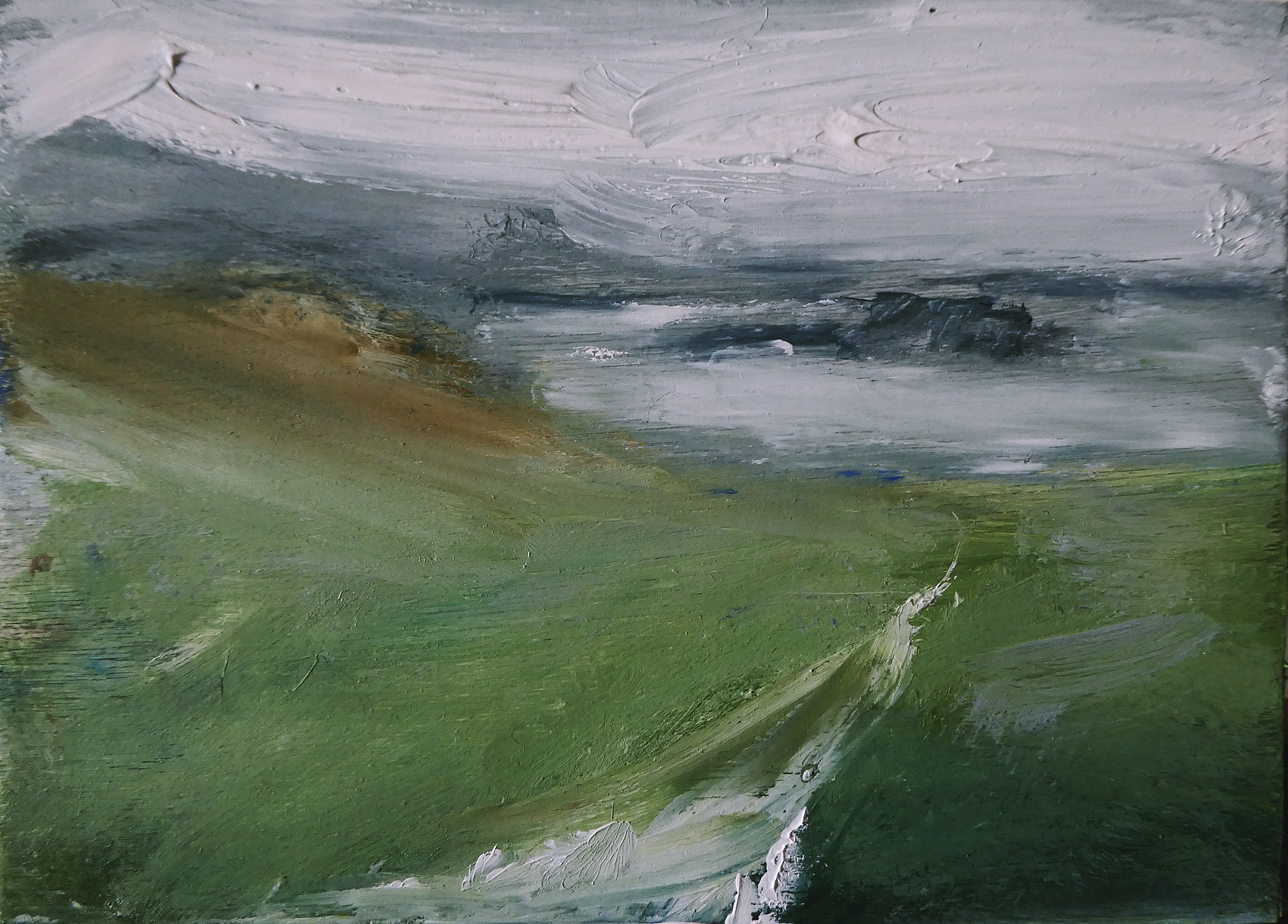 ‘Coigach 3’. Oil on 5×7″ wood. Rose Strang 2023