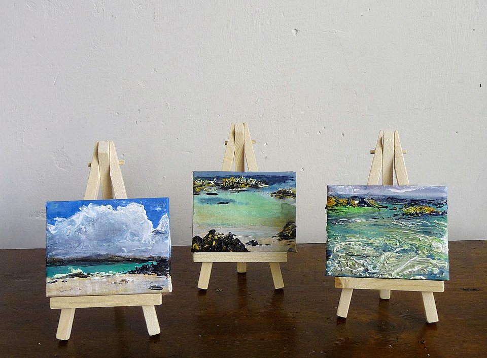 P1100370 ← Previous Next → ‘Isle of Iona’. (paintings are numbered 1 to 3 from left). Mixed media on 3.5×3 inches. Rose Strang 2019. £53 each (includes mini easel).