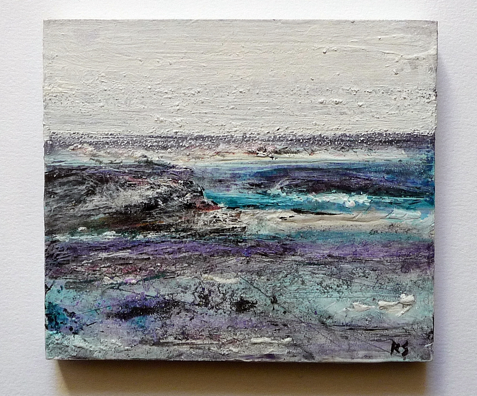 Seaspray 1. Acrylic, salt and ink on 4×4″ wood