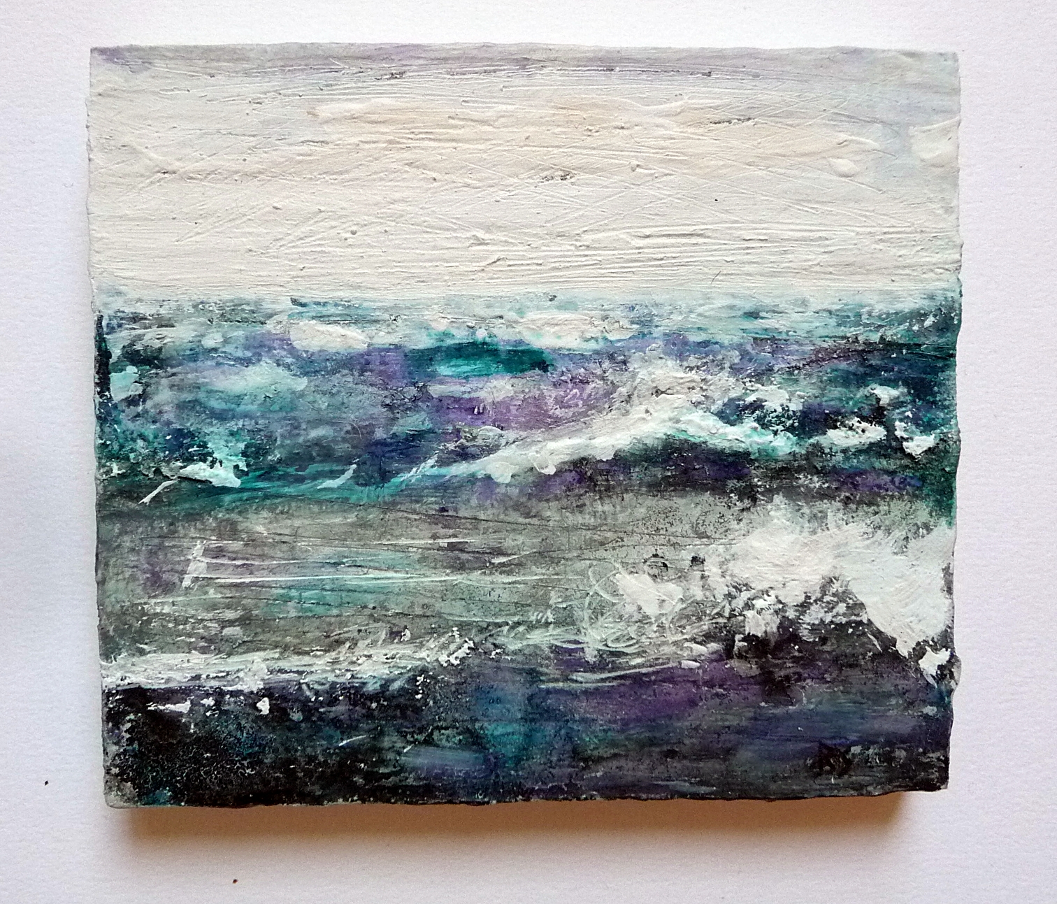Seaspray 2. Acrylic, salt and ink on 4×4″ wood