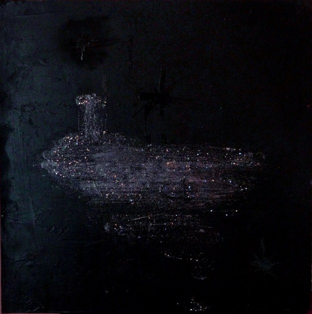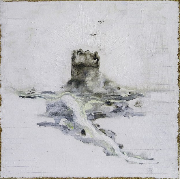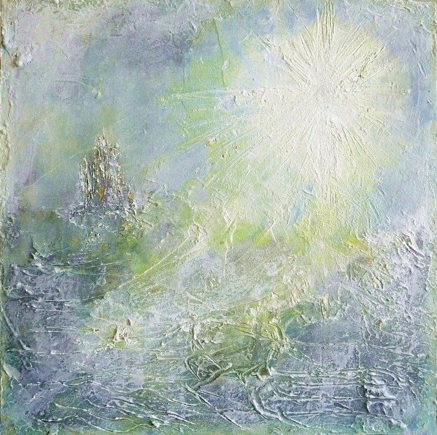 - ‘Pisces Moon, Isle of Iona’. Mixed media on 10×10″ wood panel. Rose Strang 2018. Sold.