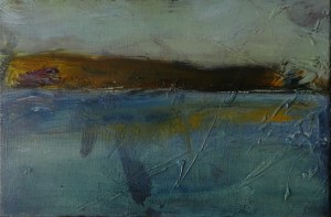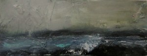 “Rose Strang observes North Beach, Iona (May) with atmospheric close-up clarity. The circle of black rocks, pale sand and turquoise shallows, lead to the misty mountains beyond with a loose, impressionistic style. Textured brushstrokes contrast the weathered ruggedness and calm serenity of the isolated beach on this Spring day. The palette is cool and luminous dominated by icy blues – waves lapping, light dancing. Strang’s poetic, painterly voice speaks not just of the physical landscape but of its ever-changing natural elements with quiet contemplation.”