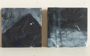 By this time I’d been feeling frustrated for days. I’d ended up with too much colour when what I’d dreamed of was a mystical elemental feel in monochrome. I looked at the two beautiful Turner sketches (below), which re-inspired me to start again with a black acrylic base, onto which I began paintings swathes of oil in various shades of pale grey.
