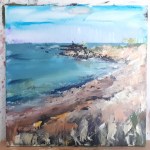 ‘Tràigh na Buirgh, Harris’. Mixed media on 9.5×9.5″ wood panel. Rose Strang 2017