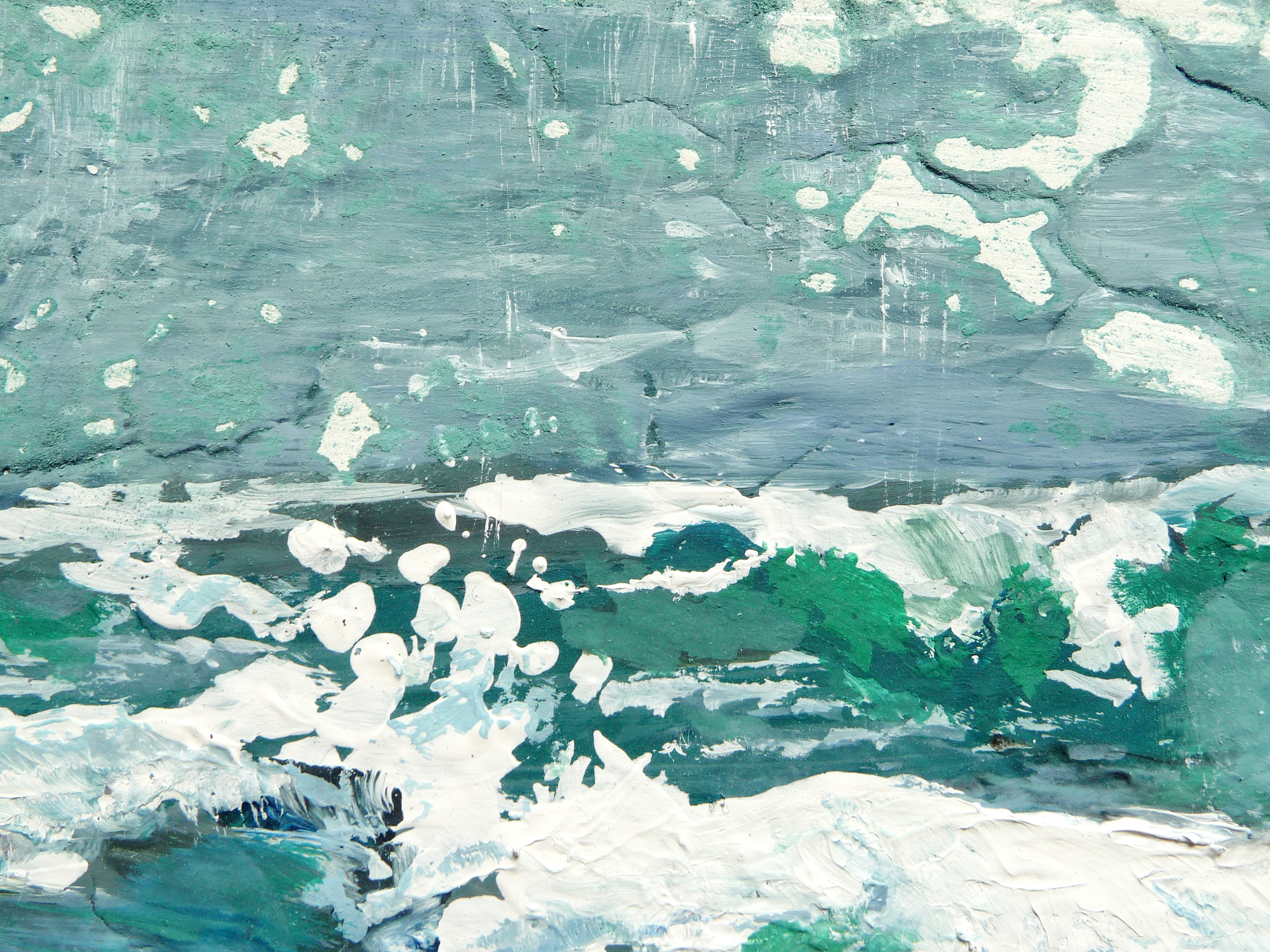 Painting movement is best achieved by making a mess I find! I try to keep the paint loose – as soon as I lose that freeness of brushstrokes it disappears. I’ve noticed that if anyone’s watching this process it looks stressful – just as it seems I’ve carefully captured a moving wave it’s time to mess that up and recreate it in looser strokes. This is one of the advantages of working in oils or acrylics, with watercolour you have to strategise more carefully. In the process of messing it up several times though, texture and interest is created.