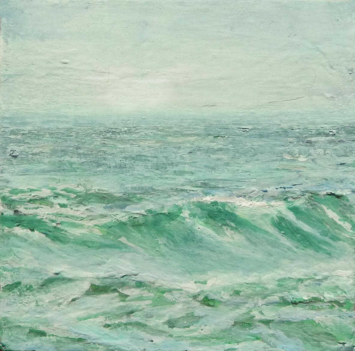 - Sold.’Traigh Bhan. Waves. Iona’. Mixed media on 12×12 inch wood board. Rose Strang 2020